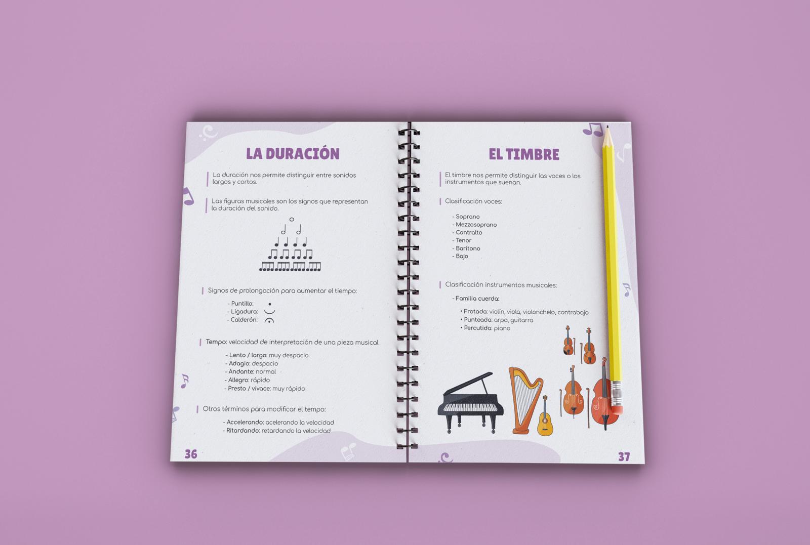 En su interior encontramos contenidos sobre las cualidades del sonido, las familias de instrumentos musicales y la iniciación progresiva hacia la escritura y lectura musical (pentagrama, compases, figuras musicales, ritmo o entonación entre otros.). Cada nivel incluye actividades lúdicas como juegos con audiciones, musicogramas o recortables.